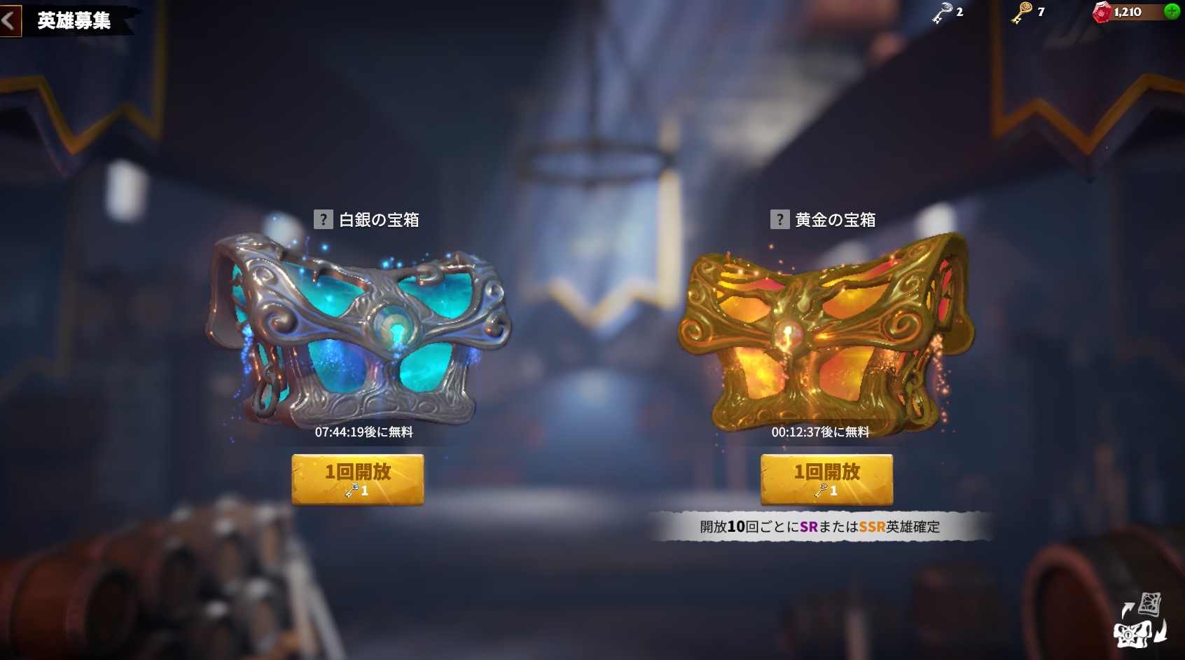 白銀の宝箱と黄金の宝箱があり、黄金の宝箱からは10回に1回の確率で、SRまたはSSRの英雄が召喚されます。