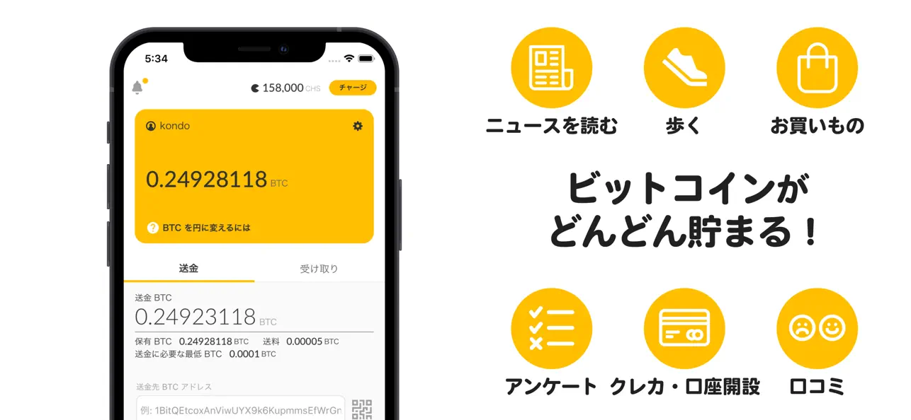 さらに、ビットコインを受け取る際に、アプリ内通貨である「CHS」を使うことで、獲得できるビットコインの量を数倍に増やすこともできます。