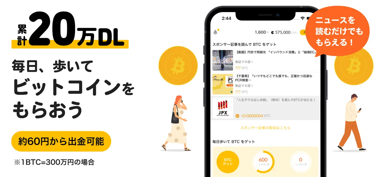 歩数に応じてビットコインを貯められるアプリはいくつかありますが、ニュースやミッション、買い物など、歩く以外の方法でも貯められるサービスはそこまで多くありません。