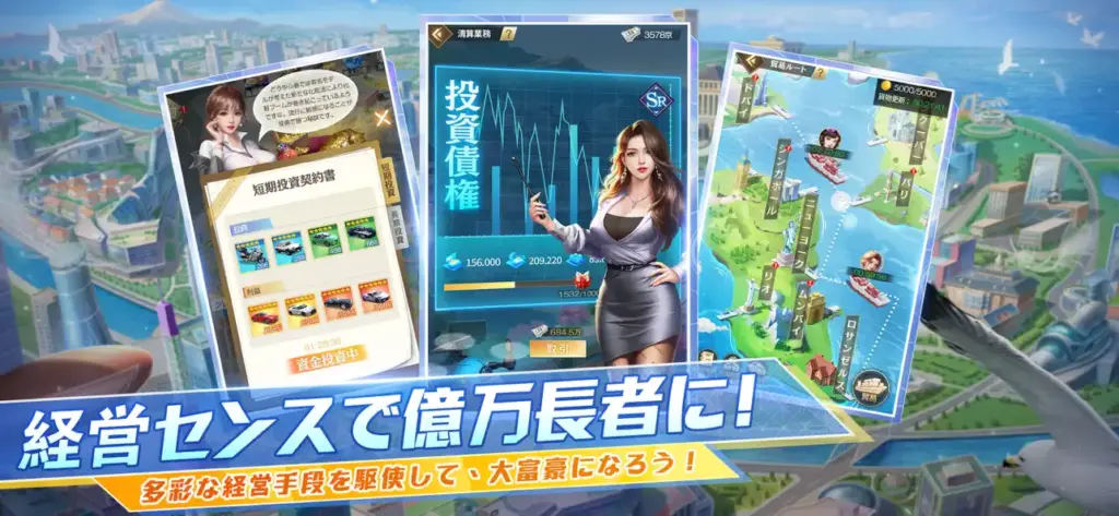 ゲーム内では、チームメンバーのサポートを受けながら他社の買収や銀行の信用を高めるなどの経営活動が行えます。