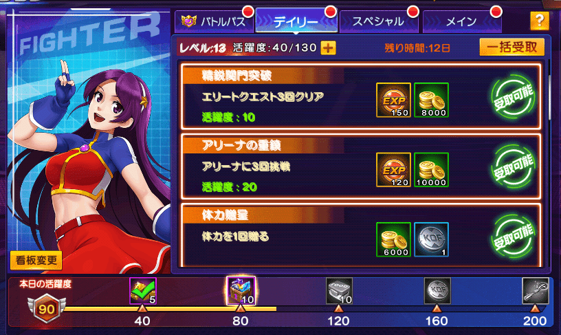 KOF98UMOLではホーム画面から「クリア報酬」のアイコンをタップすることで、全10章までのクリア報酬を受け取れます。第2章で「舞」が仲間になり、戦闘力が大幅にアップします。舞の「超必殺忍蜂」は全体攻撃なので非常におすすめです!最終的に10章までクリアすると「オメガ・ルガール」と「クーラⅩⅣ Ver」が仲間に加わり、合計で3体の仲間が増えます。