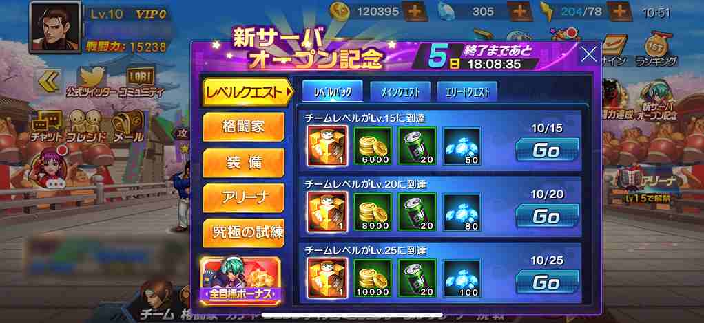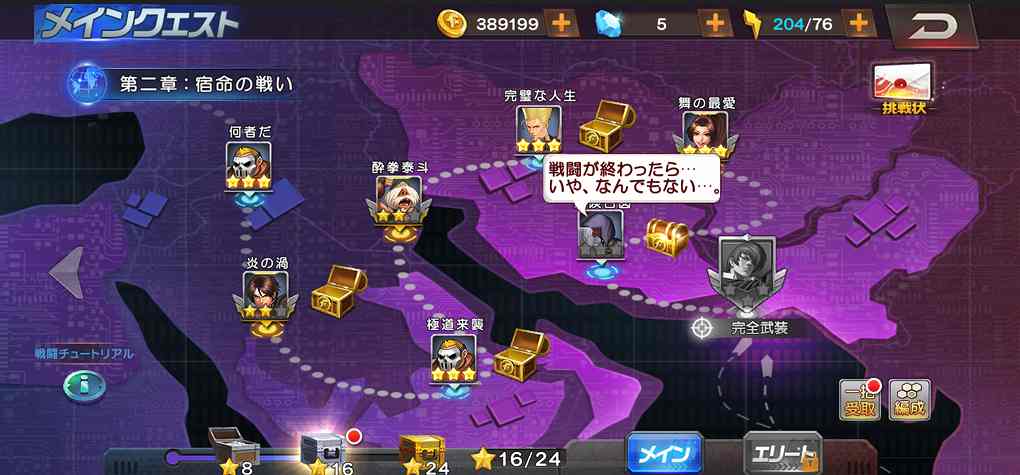 KOF98UMOLではホーム画面から「クリア報酬」のアイコンをタップすることで、全10章までのクリア報酬を受け取れます。第2章で「舞」が仲間になり、戦闘力が大幅にアップします。舞の「超必殺忍蜂」は全体攻撃なので非常におすすめです!最終的に10章までクリアすると「オメガ・ルガール」と「クーラⅩⅣ Ver」が仲間に加わり、合計で3体の仲間が増えます。