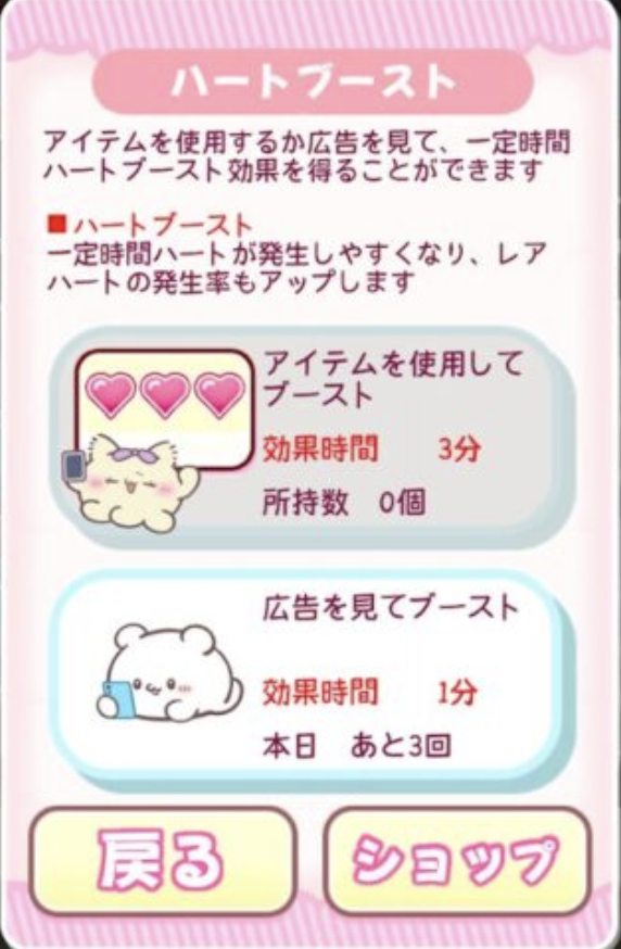 ゲーム内には動画広告を見ることで得られるボーナス機能があります。これを活用する際は、使う順番が重要です。まず「ゲージブースト」を使って、ハート獲得量を一定時間アップさせる。その効果時間中に「タイムボーナス(ハート即時獲得)」などを使う。