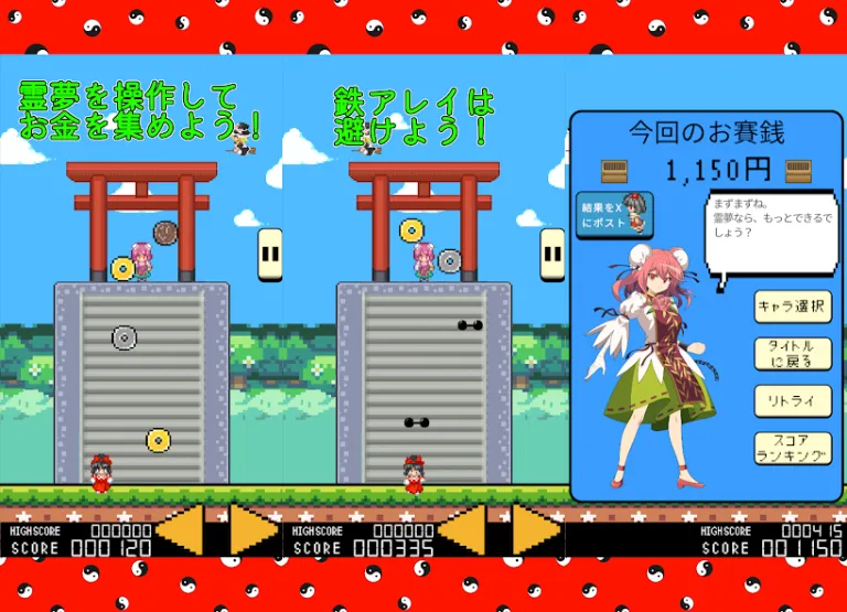 博麗霊夢をはじめとする東方キャラクターを左右ボタンだけで操作し、茨木華扇が空からばらまく5円・10円・50円・100円硬貨をひたすら回収。制限時間は魔理沙が画面左端へ走り抜けるまでの約30秒――短いながらもハイスピードで展開する緊張感がクセになります。