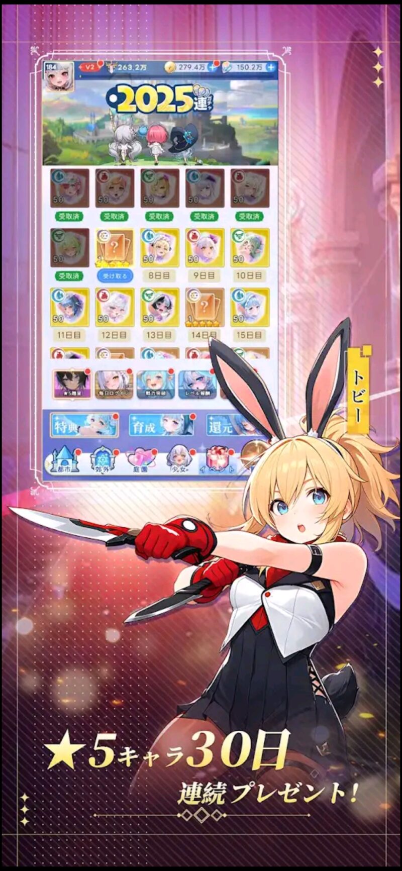 「やばい少女に囲まれた」ではゲーム開始後30日間は「星5贈呈」というキャンペーンが行われており、毎日ログインするだけでURやLRの強力なキャラを無料でゲットできます!